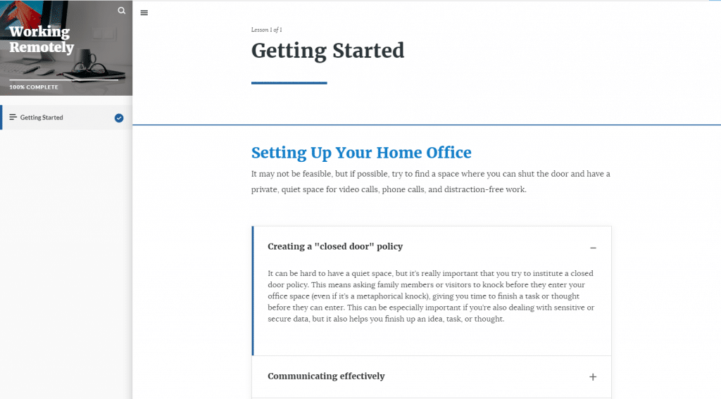 We also try to include interactive prototypes that include design elements, layout, and interactions so that clients can get a good picture of what the course will look and act like once it’s built. This allows for continuous feedback throughout the project, and allows us to work agilely, adapting and changing the project content, interactions, and design as needed.