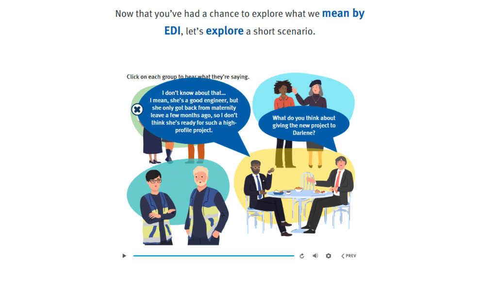 We therefore wanted to build a course that was not overwhelming to the audience, while ensuring we provided enough relevant core content for them to engage with and act upon. A key focus was on discussing common situations and scenarios relevant to TransLink employees with the EDI taskforce, so that any scenario we included felt authentic, no matter the employee’s role at the Enterprise.