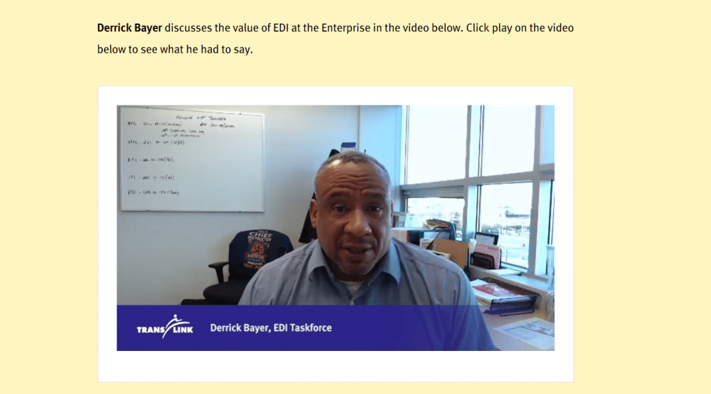 - Video interviews with TransLink Enterprise leadership and TransLink’s EDI taskforce