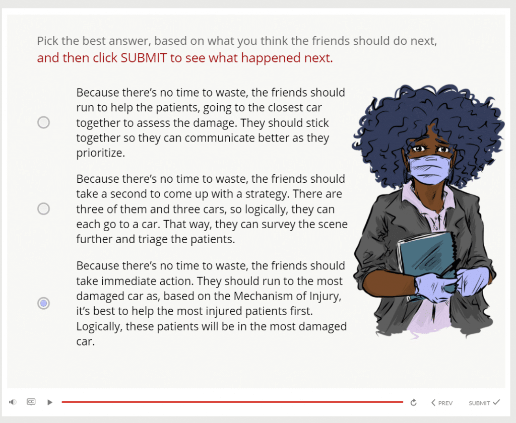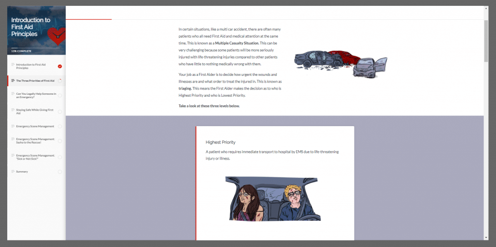 The courses follow the adventures of three friends – Ruby, Sasha, and Jay – and Ruby’s father, Richard, as they encounter different medical emergencies and use their First Aid training to help both strangers and family. We worked extensively with HCW to build out realistic situations for the characters to find themselves in and to develop these into illustration-rich animations that include professional voice narration for the physical skills aspects of the course.