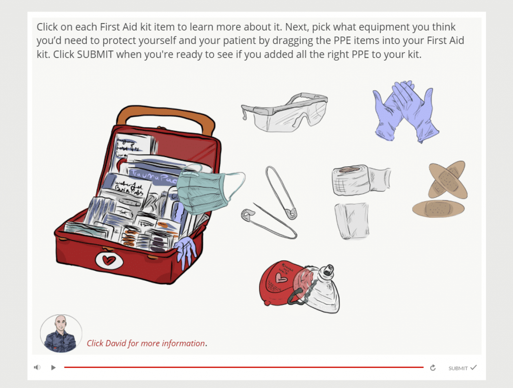 First Aid eLearning courses often tend to look the same, with lots of fake looking photos of medical emergencies or overly scientific, dry diagrams. We didn’t want to deliver the ‘same old same old.’ Our goal was to match the energy and enthusiasm of David Goodman (founder of HCW) and the company’s other instructors with the overall look and feel, while ensuring concepts were clear and easy to follow in an online format. After working closely with David and the HCW team to identify key goals, PathWise Solutions decided to make the training story- and character-driven and to develop richly illustrated and animated modules to engage, inform, and entertain learners.