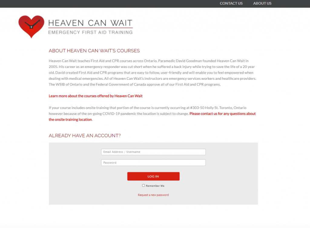 Heaven Can Wait teaches First Aid and CPR courses across Ontario to a range of audiences, focusing on providing programs that are easy to follow, user-friendly, and enable clients to feel empowered when dealing with medical emergencies. Given the need to accommodate limitations on in-person gatherings during the COVID-19 pandemic, Heaven Can Wait decided they wanted to provide a blended training model for learners. The goal was to provide flexible eLearning covering more of the theory and background information for Day 1 of training that would then complement smaller groups of in-person Day 2 training.