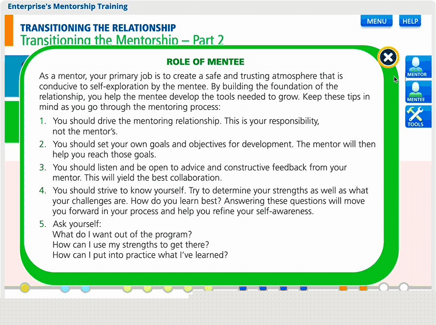 In order to make the course relevant to learners and real life experiences, the course focuses on a series of scenarios between two characters, a mentor and mentee– similar to the change management course. The scenarios explore the different stages of the mentorship process and allow the learner to catch glimpses of what they might experience in the program along the way.