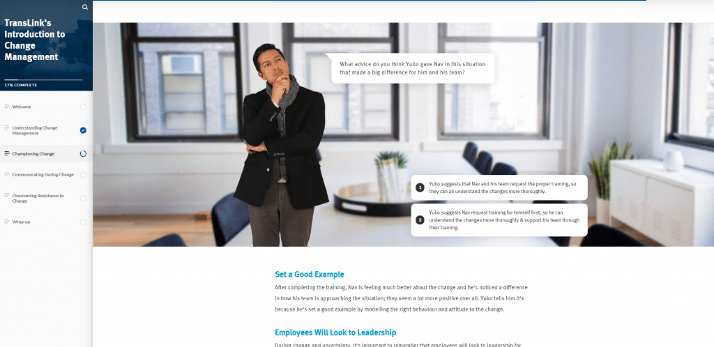 Working closely with TransLink, PathWise focused on developing a course that gives learners the opportunity to explore common change management concepts, receive coaching on common change management challenges, and develop strategies for overcoming resistance in a no-risk environment. Learners test their understanding and apply the concepts covered in the course through scenarios based on real-life situations, following the journey of a fictional supervisor and manager. This storytelling approach helps engage learners and adds a layer of richness to the content, while providing relevant feedback for learners to help them improve their understanding of change management.