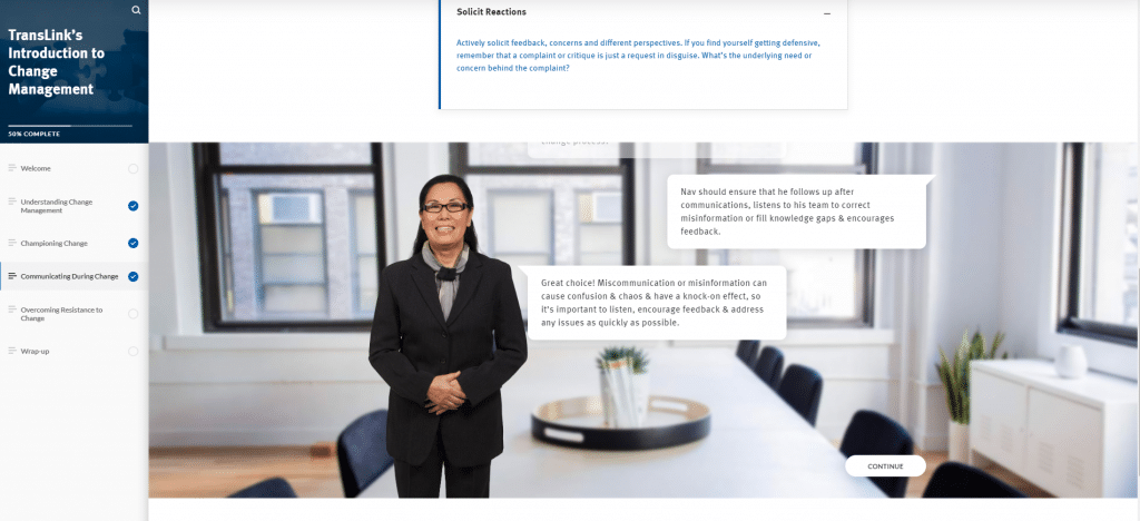 In order to accommodate multiple learners, TransLink wanted to create a 30-minute eLearning version of their Instructor-Led Training (ILT) on change management – an important topic for middle managers and supervisors at the organization. The goal of the eLearning course is to provide those managers and supervisors with the information and skills they need to better communicate and manage change and, as importantly, to help their teams accept change.